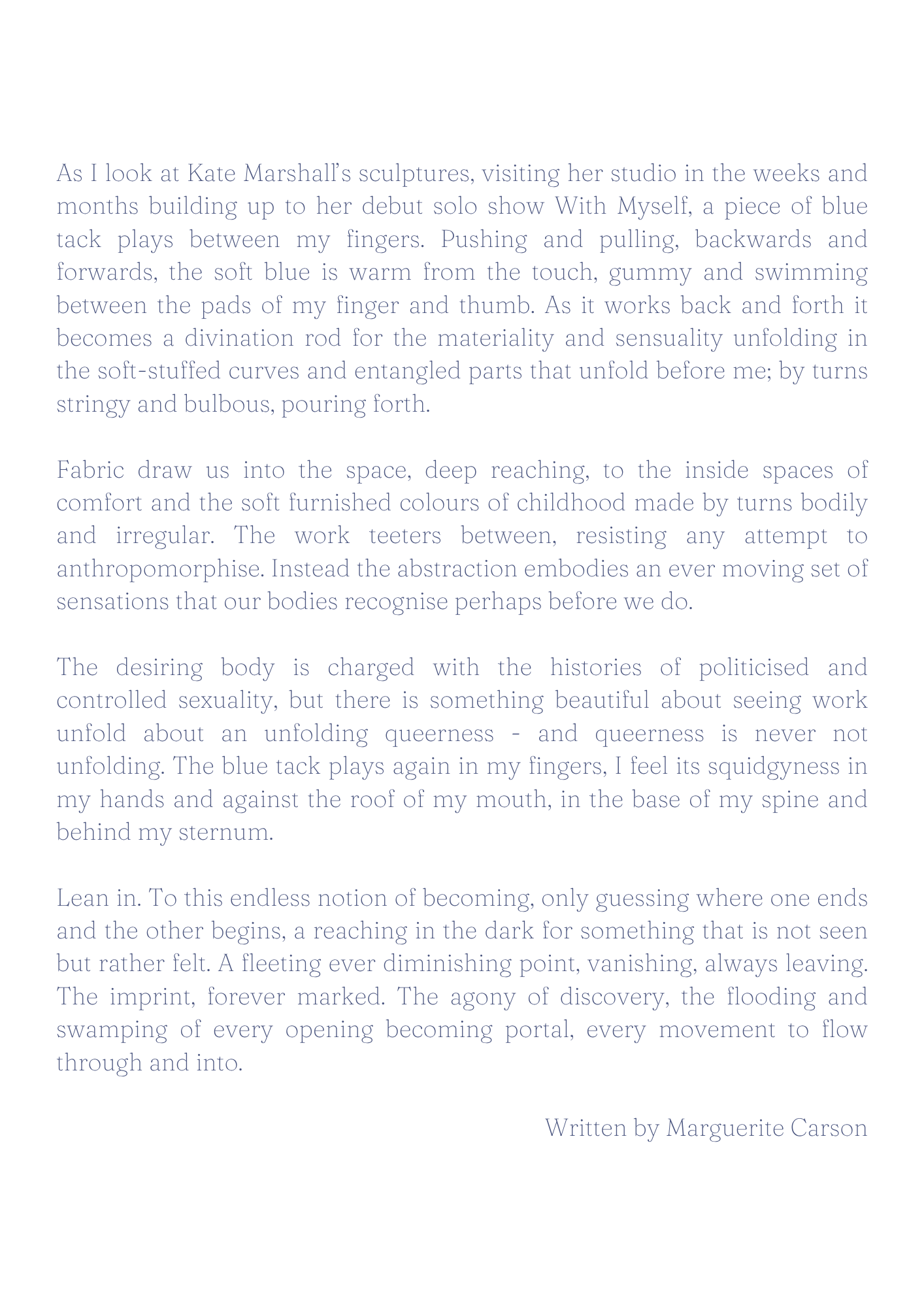 My MFA project reimagines intimacy through soft sculpture and performative self-portrait photography, in the creation of an immersive installation. I engage play, performativity, and fluidity in my queer methodology for reconstructing the phenomenon. Through embodied practice, these strategies facilitate alternative experiences of time, space, and relationality which challenge the constraints of learned Western heteronormativity. This project brings autobiographical reflections into conversation with the theory of affective intimacies, phenomenology, and a queer methodology to cultivate an expanded and imaginative personal relationship with intimacy.